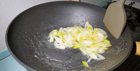 3.炒锅内淋入少许植物油,油热转中火先下入葱白,煸炒2分钟左右,把葱白炒香。