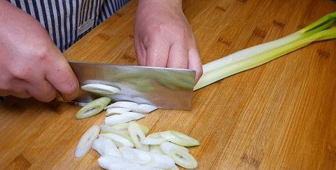 1.三根大葱剥去外皮清洗干净,然后斜切成段,切好的葱白和葱叶要分开摆放。