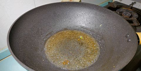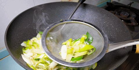 5.用一个漏勺把葱白和葱叶捞出,按压一下,过滤出多余油脂,这样锅内的油会有葱香味。