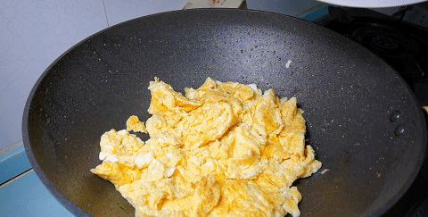6.转大火把锅内油温烧热,然后淋入鸡蛋液,刚下锅不要翻动,等蛋液凝固的时候再炒成鸡蛋块。