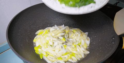 4.炒至葱白表面微黄后下入葱叶,再次煸炒1分钟,把葱叶炒软。