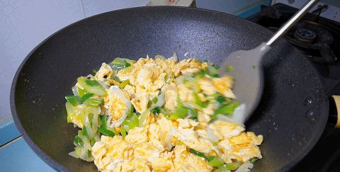 8.鸡蛋中已经有食盐,后续不用再放,把鸡蛋和大葱翻炒均匀后即可出锅。