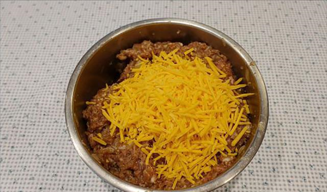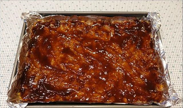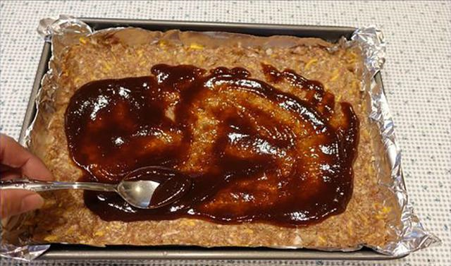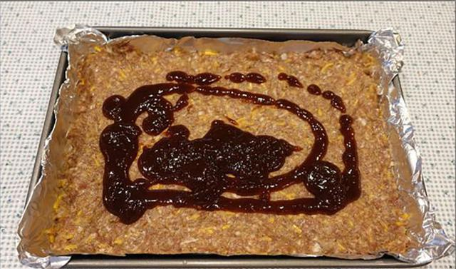 5. 表面材料烤肉酱,倒在绞肉上面。