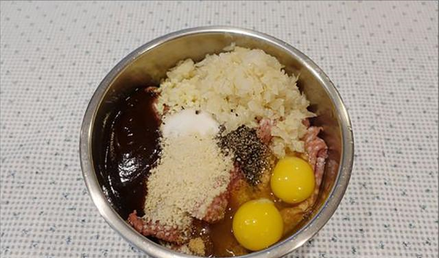 2. 绞肉加入所有调味料、洋葱及蒜末拌匀。