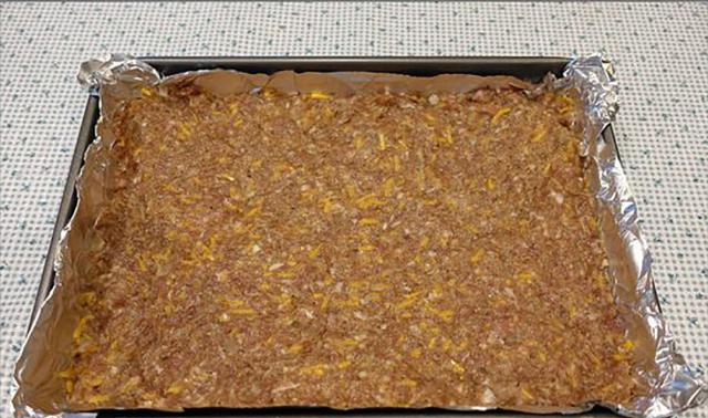 4. 我用13x9寸的烤模,铺上防沾纸,再将拌好的材料,均匀的放入烤模内铺平。