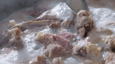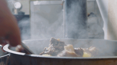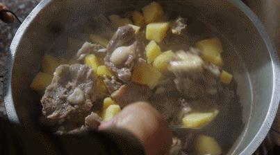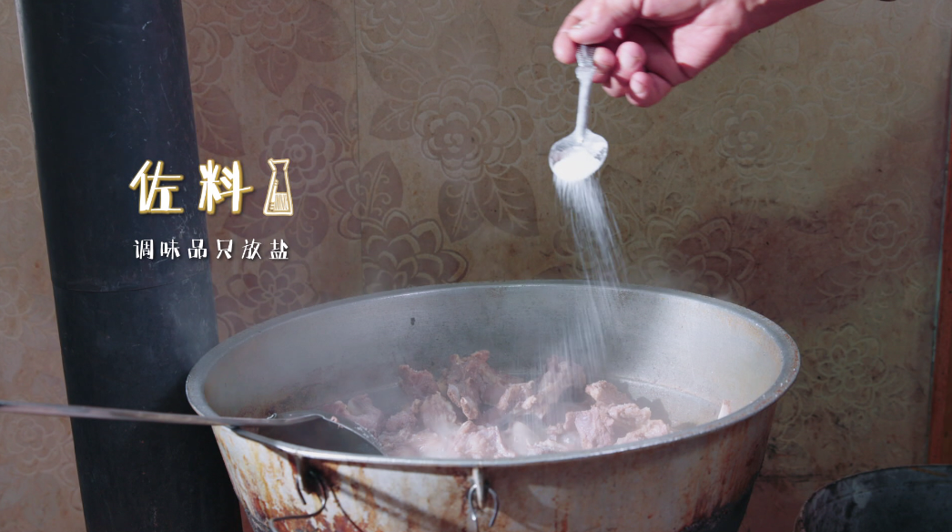 盐是这道菜的唯一调料,但是作为强电解质,盐的过早加入会破坏羊肉的细胞膜,使羊肉中的水分流失、肉质变柴,因此,炖煮一个小时以后,等到羊肉纤维完全软化,盐才能登场。