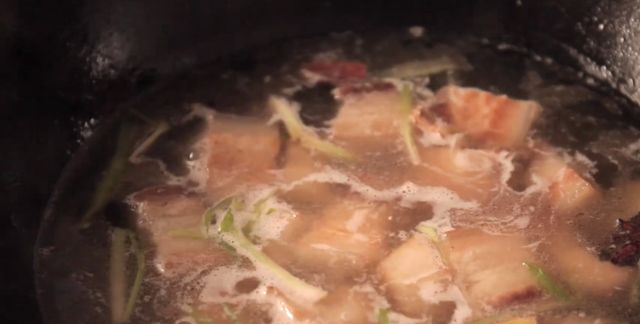 9.待开水表面浮起泡泡后,依次添加一勺生抽酱油、半勺老抽酱油,以及方才调好的半碗腐乳与腐乳汁的混合物。在大火将锅中的混合液体烧开之后,转而调整为小火。然后扣上锅盖,烹煮一个小时。