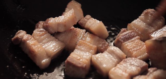 5.将少量食用油倒入锅中,烧至四成热时,将火调整为小火,然后放入五花肉,用小火煎出油。
