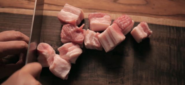 1.取出一块肥瘦相称得上好五花肉,用刀将其切成整整齐齐的小方块。