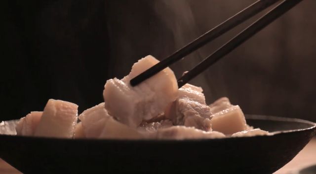 4.水煮开后,再接着煮上两分钟,然后将五花肉控干捞出,并放入碗中,留在一旁备用。
