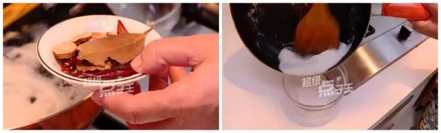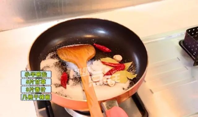 把小半碗食盐倒入锅里,放5片甘草、3片香叶和几根干辣椒,开小火慢炒。▽