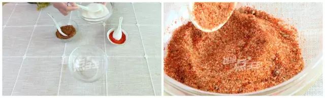 在碗里放1勺盐、2勺辣椒粉和3勺红糖粉,搅拌均匀,这是完美比例,一定要记住!▽