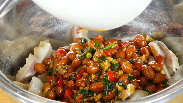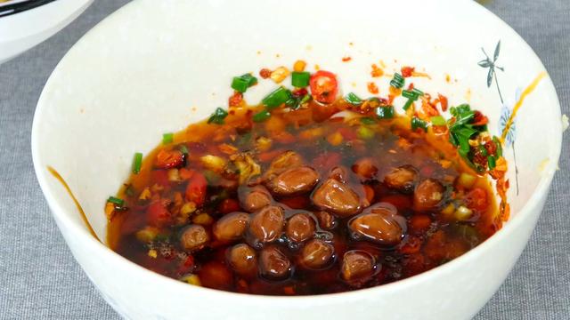 第五步:炒花生米的油不用扔了,把油温烧热之后,直接淋在装有葱花小米辣的碗里,同时用筷子快速翻拌,防止上面一层的食材烫糊了,用高油温激发出配料的香味,后续吃起来会更鲜香,接下来继续往碗里加入一勺食盐,一勺白糖,一勺鸡精,一勺味精,适量的蚝油,适量生抽,适量陈醋,适量芝麻香油,适量辣椒油,再加入适量的花生米,用筷子搅拌均匀,咱们的酱汁也就调好啦,拌好的酱汁放一旁备用。