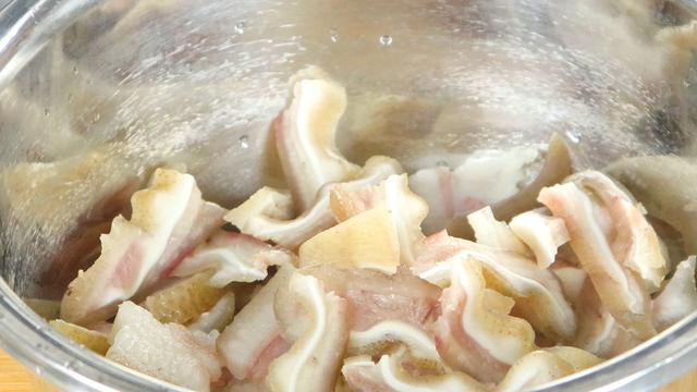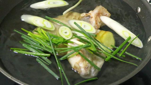 第二步:起锅,加入适量的冷水,再把清洗好的猪耳朵放进锅里,把之前切好的葱姜一起放进锅里,再加入适量的料酒,冷水进行焯水,水开后继续焯水,直到用筷子可以轻易地把猪耳朵戳穿,就说明猪耳朵已经熟透了,这个时候就可以把猪耳朵捞出来,清洗干净备用。