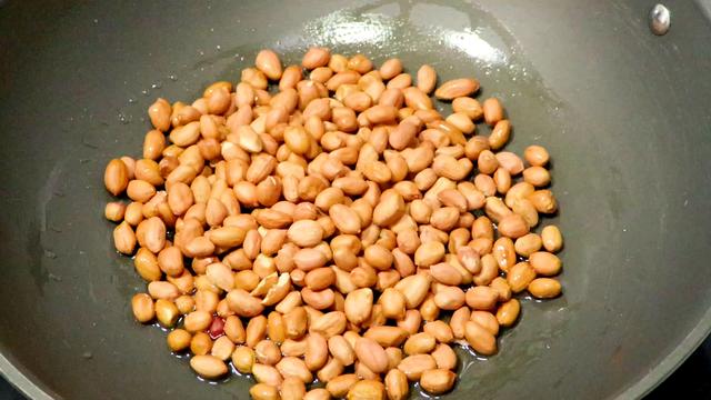 第四步:起锅,加入适量的食用油,冷油倒入花生米,把花生米当中的水分炒干,在炒花生米的时候,大家不要着急开大火炒,不然花生米的外皮就容易炒糊了,后续吃起来的口感既不酥脆,还会发苦,用小火慢炒,就可以把花生米当中的水分炒干,而且外皮金黄,酥香又好吃。