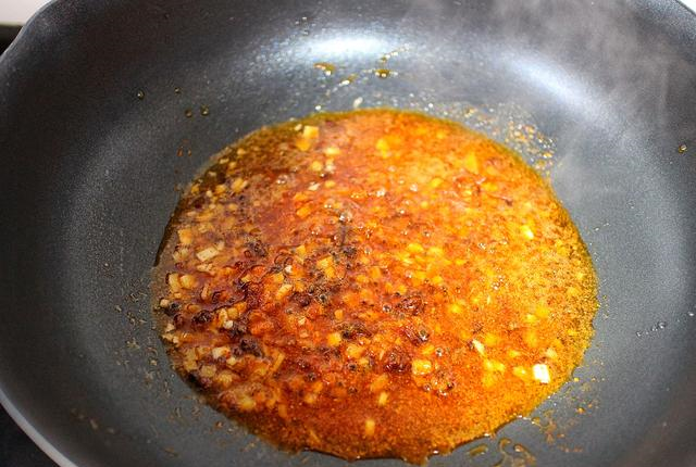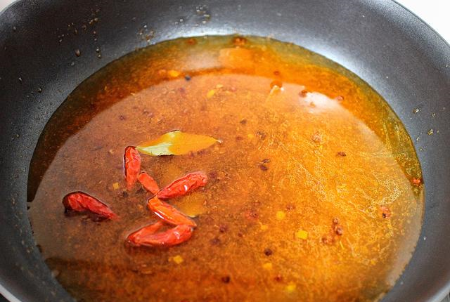 4、锅内倒入适量的油,油温烧热后,我们先将花椒、大蒜粒、生姜粒、红油辣椒酱、辣油、辣椒粉下锅,用中小火煸炒出香味来