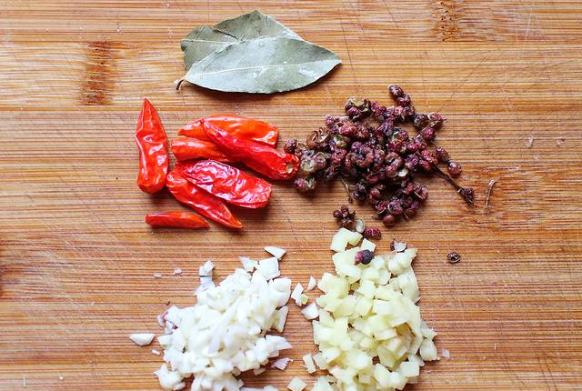 3、然后在准备一些辅料,将香叶、尖辣椒、花椒洗干净待用,大蒜和生姜切成细小的碎丁状待用。这些辅料食材缺一不可,大家在同步制作的时候,可不要遗漏食材哦,因为这些辅料都是具有去腥、提香的作用!