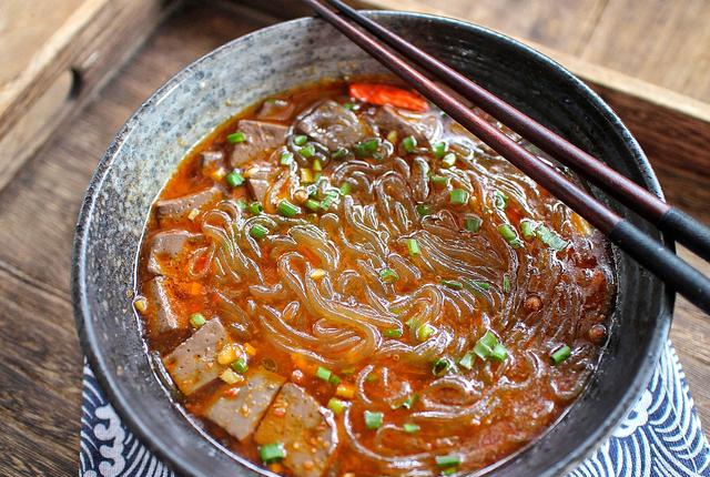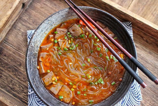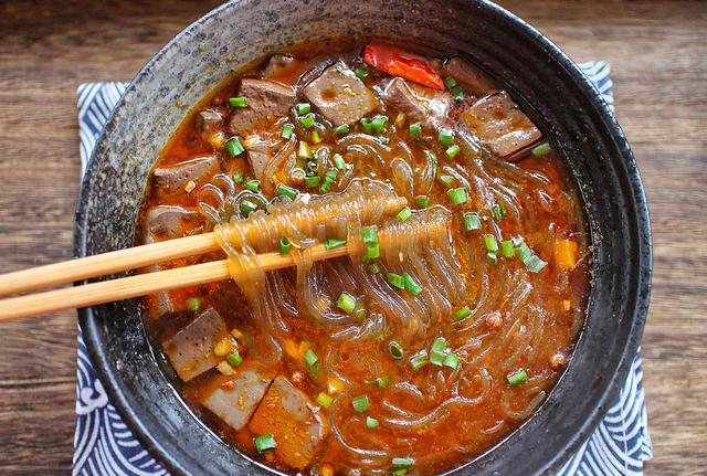 6、待汤汁煮沸后,我们将泡软的粉丝下锅,转中火煮3到5分钟,即可出锅享用。其实除了放鸭血之外,你也可以放方腿等其它自己爱吃的食材