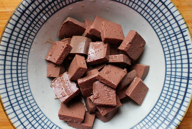 2、接着我们将鸭血洗干净,切成小的方块状待用,其实食材的用量不是绝对的,喜欢吃哪个,就多放些