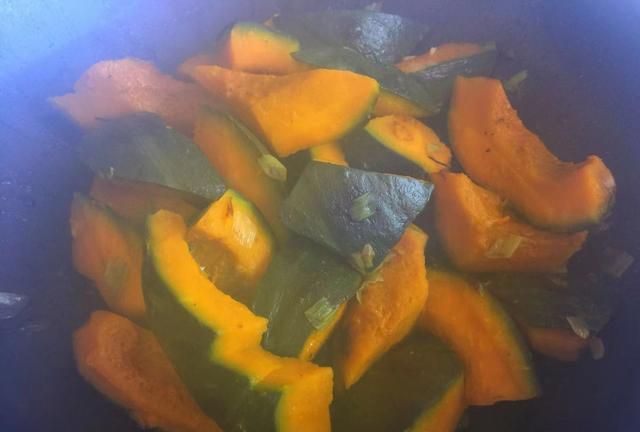 6,南瓜要多煸炒一会儿,把南瓜的切面煸炒上色,有微焦的状态更佳,如上图所示。