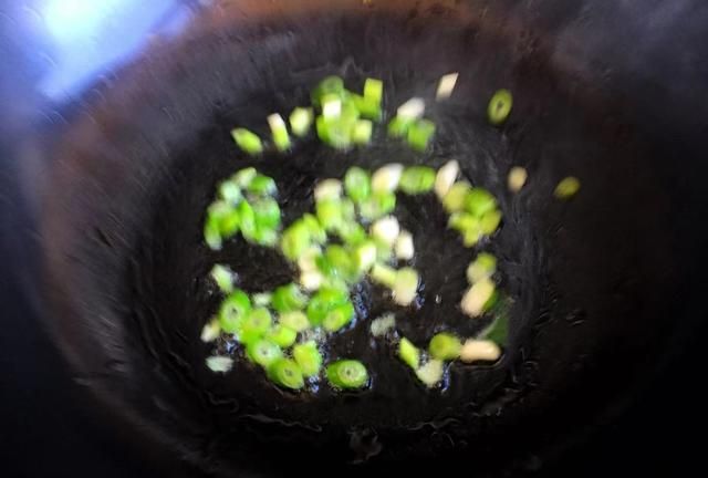 4,起锅加入适量的玉米油,在油温不是很热的时候放入葱花,小火煸炒出香味,这样等油热的时候葱花的香儿也就煸炒出来了,如上图所示。