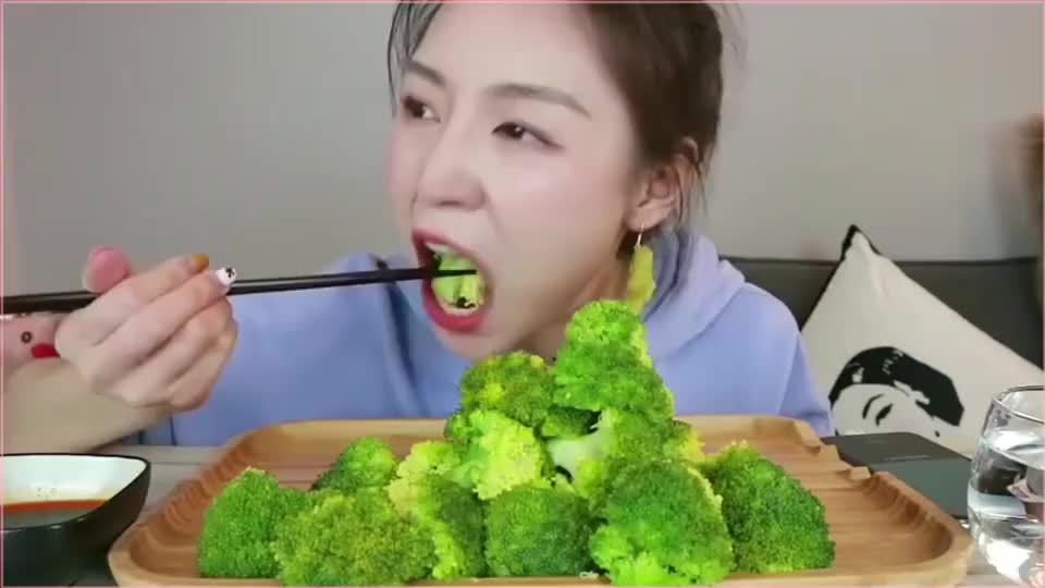 美食:小姐姐大口吃西兰花,也不蘸调料,这样吃不得吃的脸都绿了