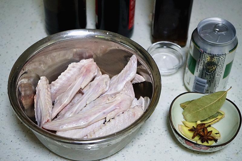 【所需食材】:鸭翅500g,八角两个,桂皮一块,香叶两片,冰糖几块,老抽一勺,生抽酱油一勺,啤酒一罐,盐适量,胡椒粉一勺,姜一块
