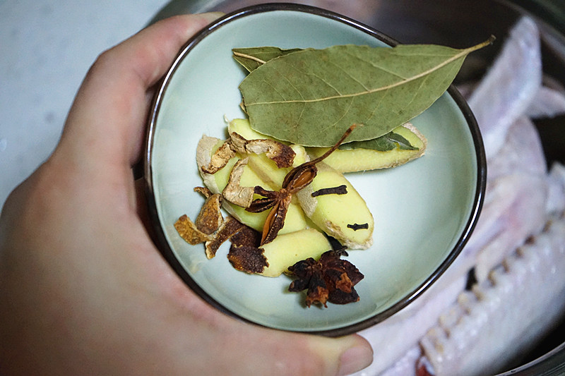 2、香辛料要准备充足,姜切片放在一起。如果有高度白酒的话,最好用高度白酒浸泡一下香辛料,这样可以充分发挥香辛料的香味。