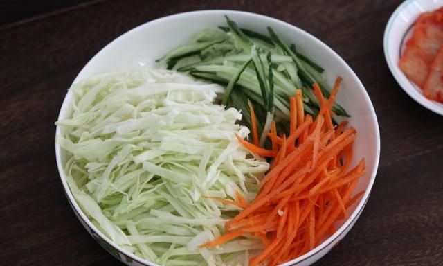 3、配菜都清洗干净之后,沥干水分,切成细丝备用。这里面的辣白菜算是点睛之笔,不仅可让整体的颜色更加鲜艳,也能口味更丰富。如果没有辣白菜的话,用剁椒酱来代替也是一样的。