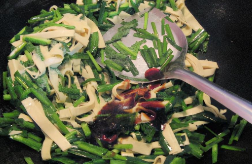 3、韭菜下锅炒时间不可长,快炒出锅,所以韭菜需要在出锅前放入,否则会变老,嚼不动,豆腐皮耐炒,可以事先放入锅中炒一炒,让其可以更入味,这道菜搭配调味很简单,蚝油和食盐这两样便可,口感相当美味。