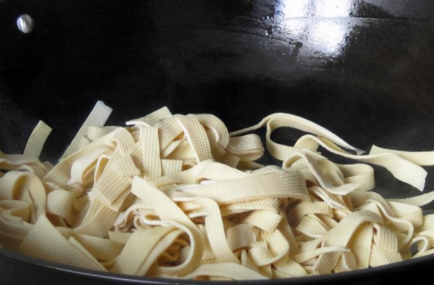 2、豆腐皮切成稍微粗一点的条,不要太细了,否则容易发干,如果不喜欢豆腥味重的,可以事先将豆腐皮放入开水锅中煮30秒,便可很好去除豆腐皮的豆腥味,不介意的便可直接炒;